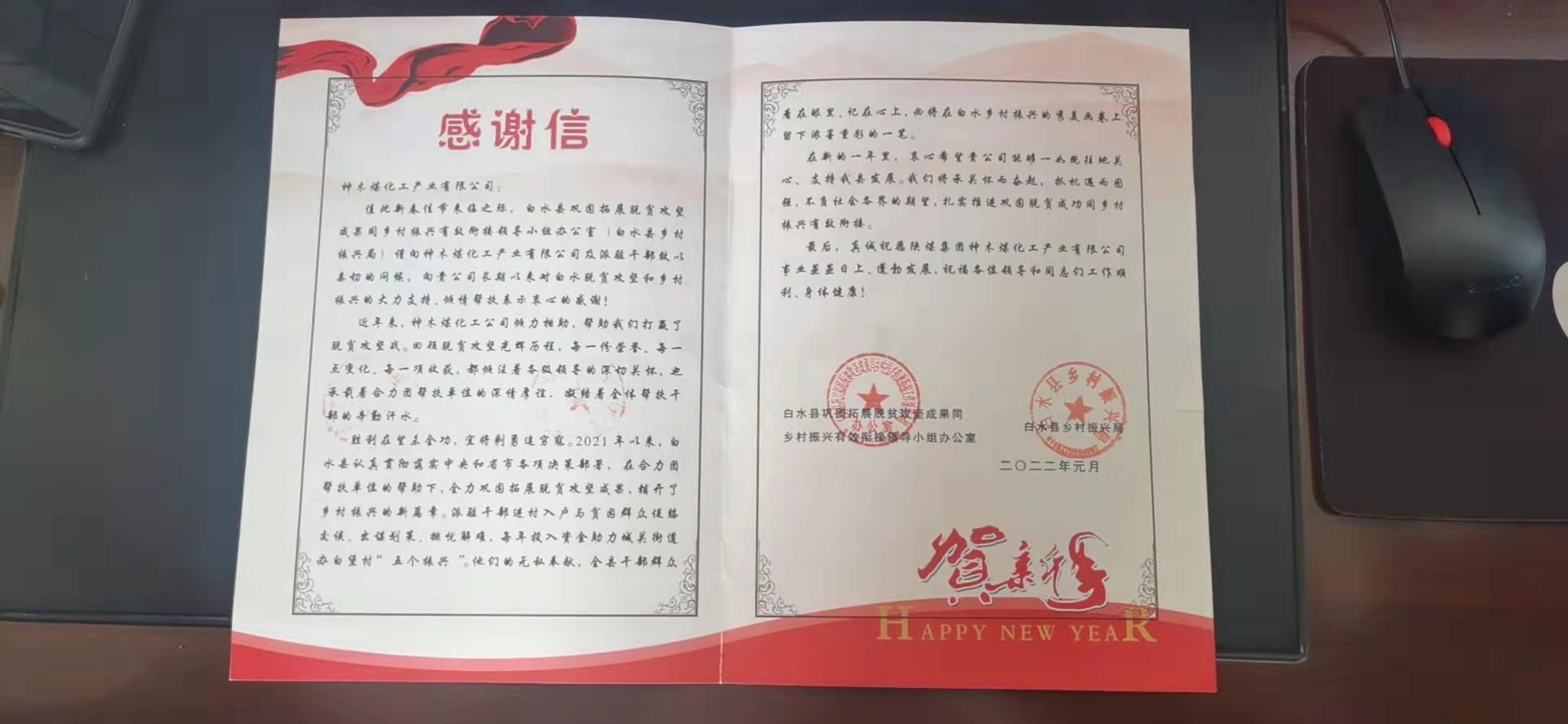 訪問次數:4829日月其邁,時盛歲新。春節前夕,白水縣鞏固拓展脫貧攻堅成果同鄉村振興有效銜接領導小組辦公室、白水縣鄉村振興局向神木煤化工發來感... -