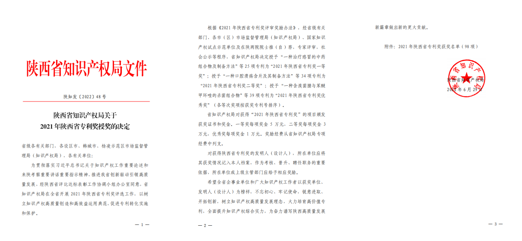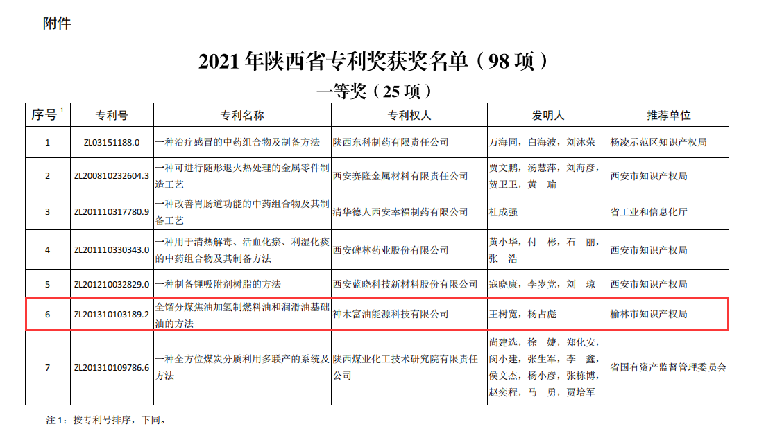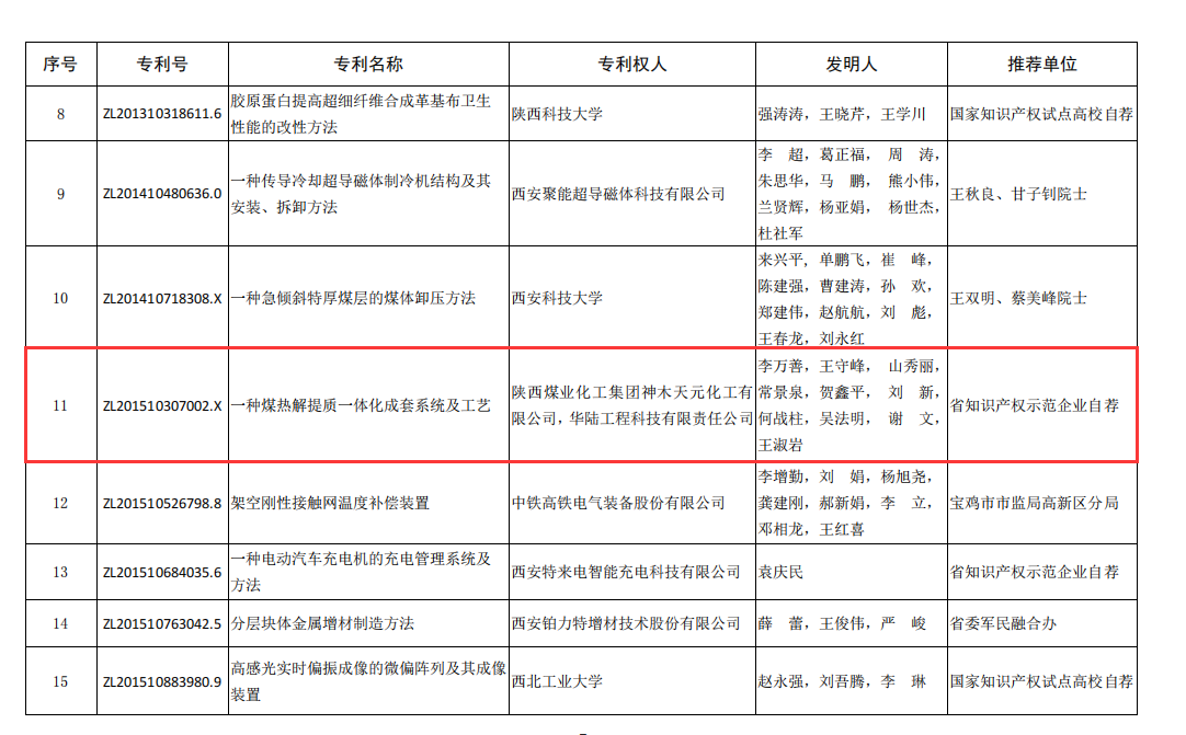 神木煤化工公司兩項發明專利榮獲2021年度“陜西省專利獎”一等獎