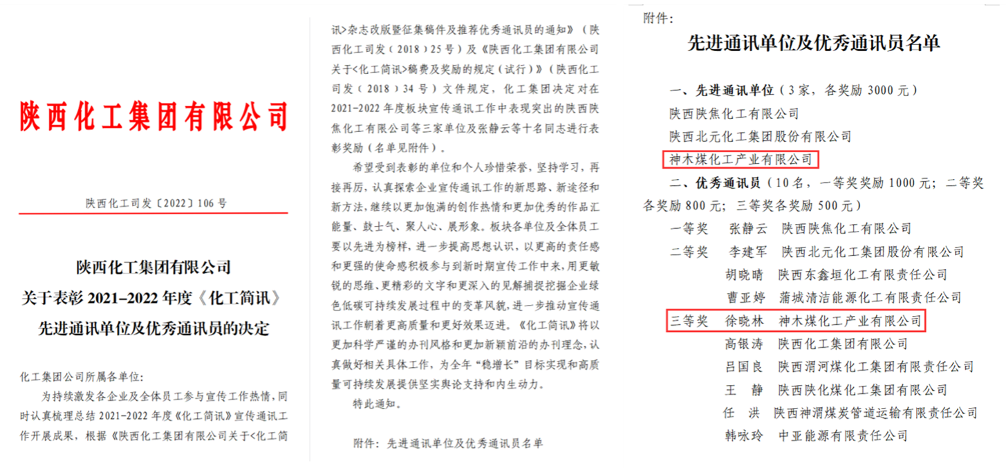 近日,從陜西化工集團有限公司獲悉,神木煤化工公司被評為“2021—2022年度《化工簡訊》先進通訊單位”,這是該公司連續兩年獲此殊榮。該公司職工徐曉林被評為“優秀通訊員”。