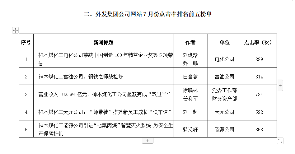 關于2022年7月份神木煤化工公司發稿及優秀稿件評選情況的通報