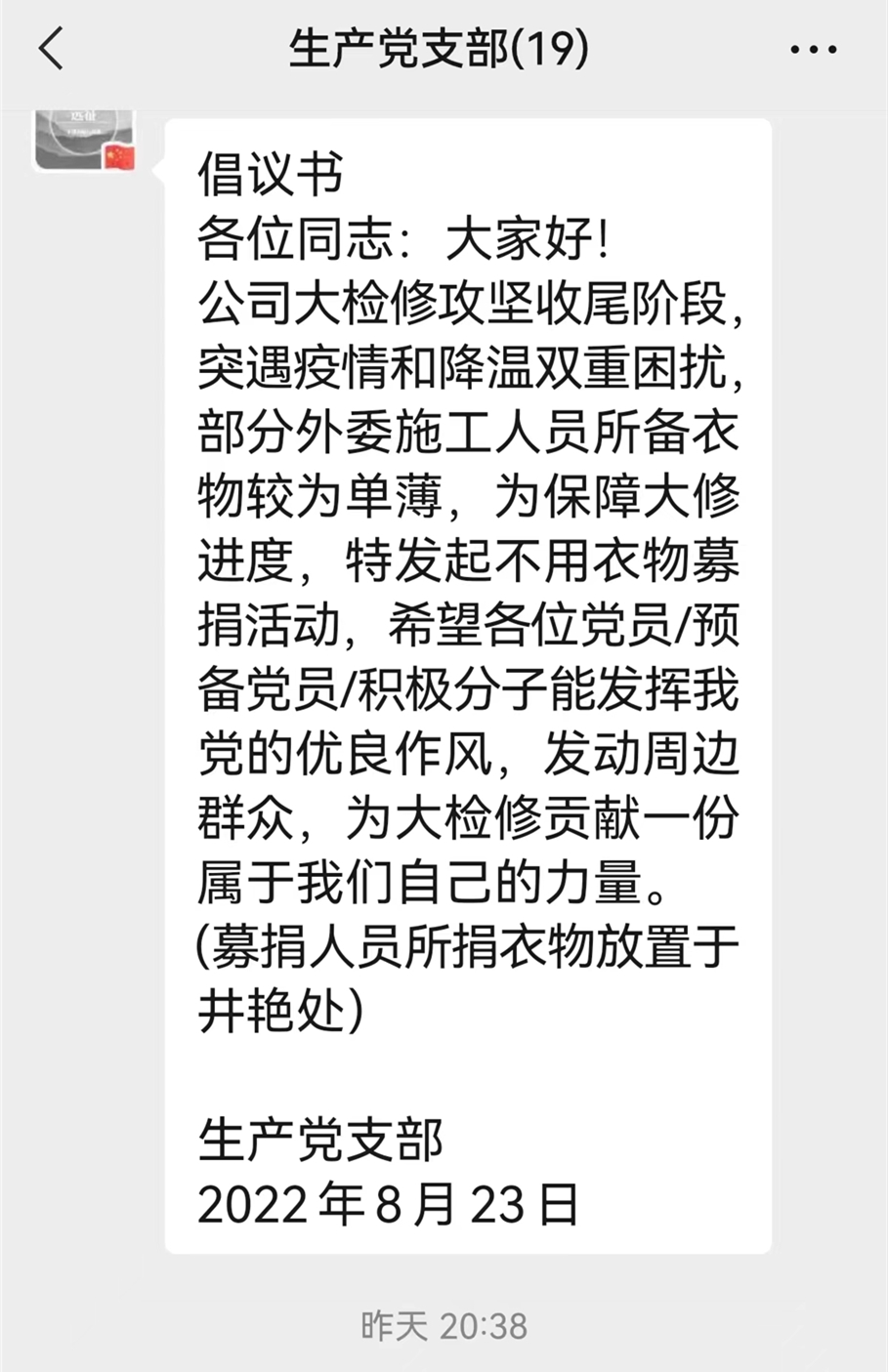 8月23日,一份倡議書出現在了生產黨支部群里,神木煤化工泰和公司大檢修攻堅收尾階段,突遇疫情和降溫雙重困擾,部分外委施工人員所備衣物較為單薄,特發起衣物募捐活動。