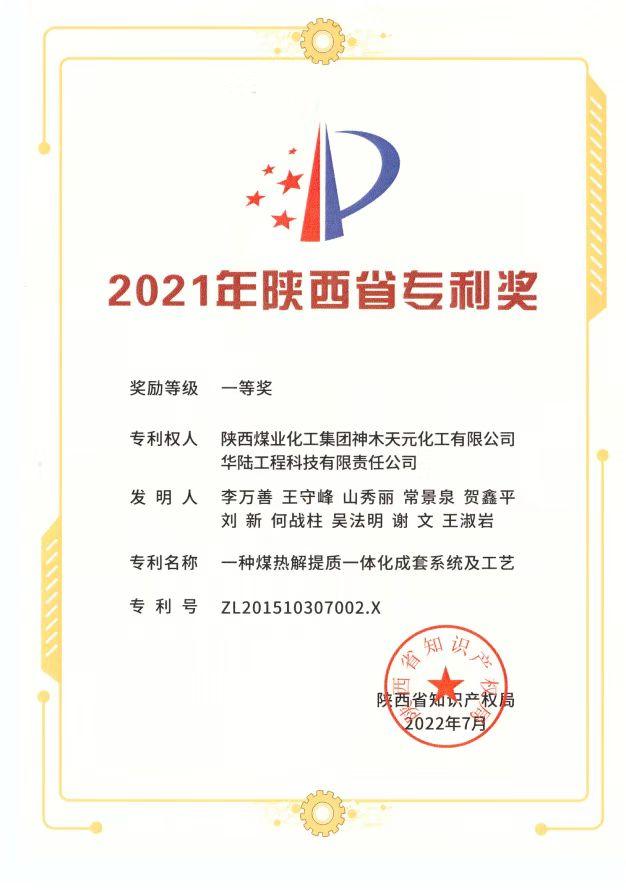神木煤化工公司兩項發明專利獲2021年度陜西省專利獎一等獎
