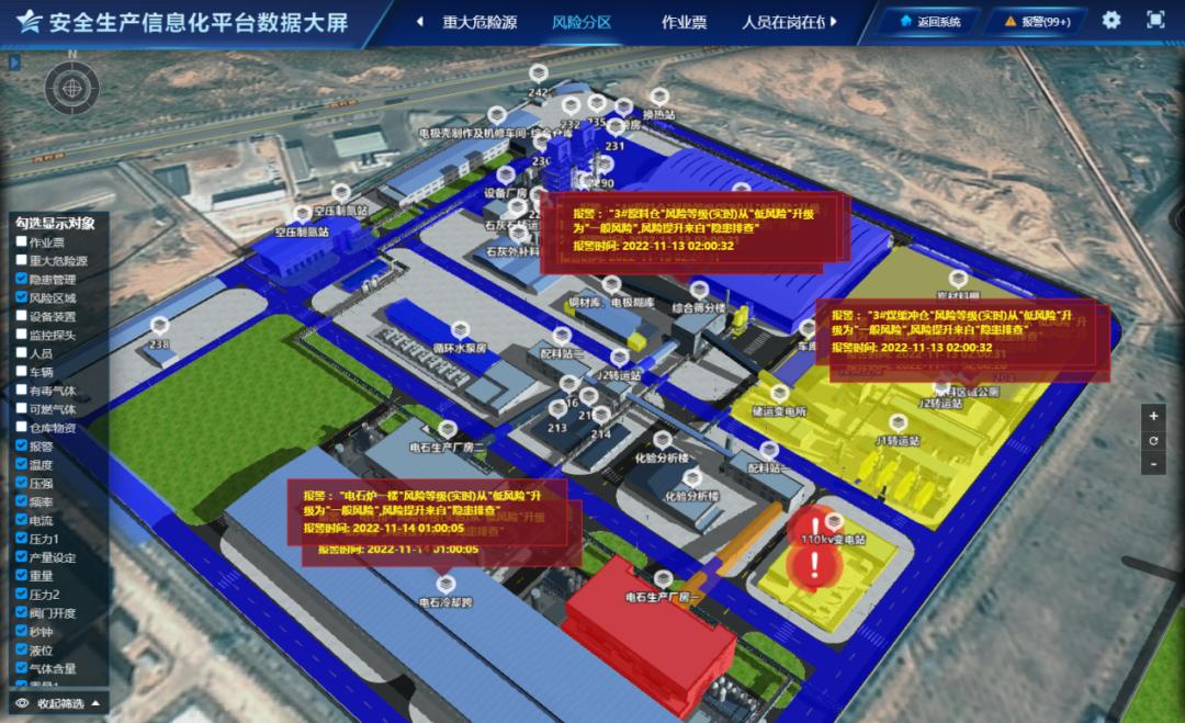 風(fēng)險(xiǎn)分級(jí)管控通過(guò)《風(fēng)險(xiǎn)評(píng)估清單》,系統(tǒng)會(huì)自動(dòng)生成隱患排查工作任務(wù),由指定的排查人員進(jìn)行現(xiàn)場(chǎng)風(fēng)險(xiǎn)評(píng)估確認(rèn),如未及時(shí)進(jìn)行隱患排查任務(wù)時(shí),系統(tǒng)將會(huì)自動(dòng)在調(diào)度指揮中心的三維地圖上出現(xiàn)預(yù)警提示。
