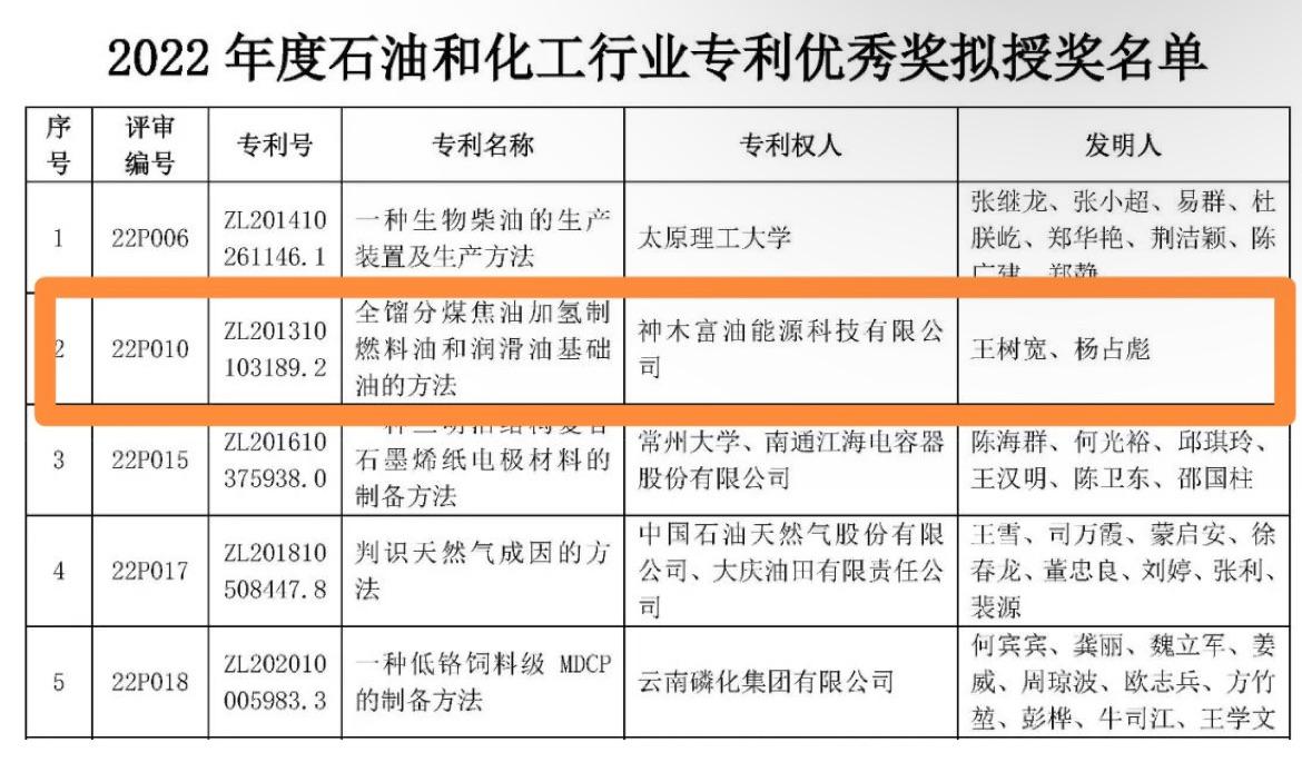 近日,中國石油和化學工業聯合會公布了“2022年度石油和化工行業專利優秀獎”獲獎名單,神木富油能源科技有限公司發明的“全餾分煤焦油加氫制燃料油和潤滑油基礎油的方法”(ZL201310103189.2)榮獲專利優秀獎。