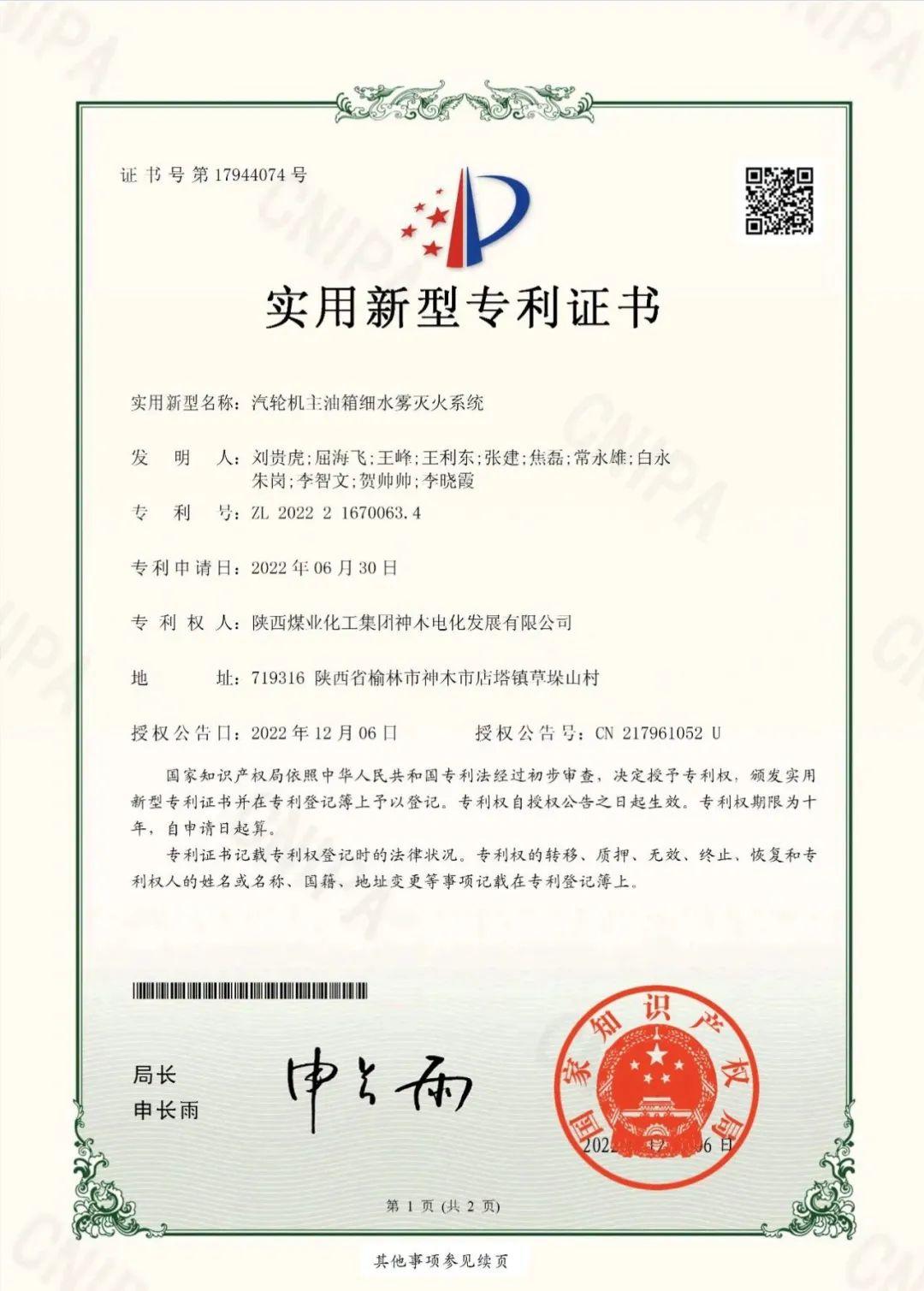 近日,電化公司自主研發(fā)的“汽輪機主油箱細水霧滅火系統(tǒng)”經過國家知識產權局審查,獲得國家實用新型專利授權。