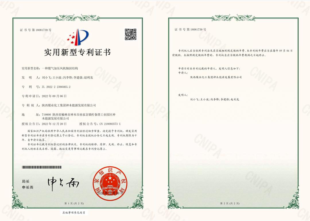 12月20日,能源公司自主研發“一種煤氣加壓風機軸封結構”獲國家知識產權局實用新型專利授權。