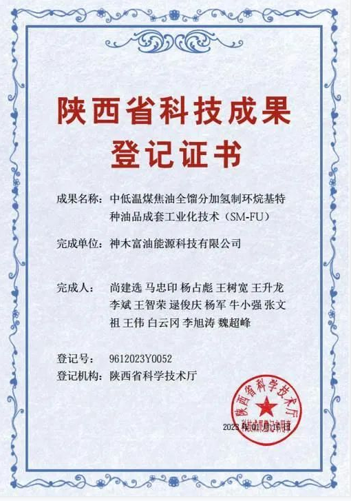 近日,富油公司自主研發的“中低溫煤焦油全餾分加氫制環烷基特種油品成套工業化技術”榮獲了陜西省科學技術廳頒發的科技成果登記證書。