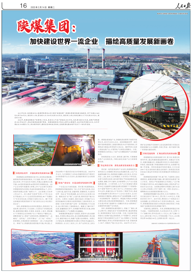 2022年,陜煤集團煤炭產銷量超2.3億噸,各類化工產品產量接近2000萬噸,發電量突破500億度,粗鋼產量保持在1200萬噸水平,其他實物量指標穩中有進。陜煤集團連續8年進入世界500強榜單,2022年躍升到第209位,位列中國企業500強第67位,排名穩步提升,展現出良好的成長韌性,在高質量發展征程中交出了一份優異答卷。