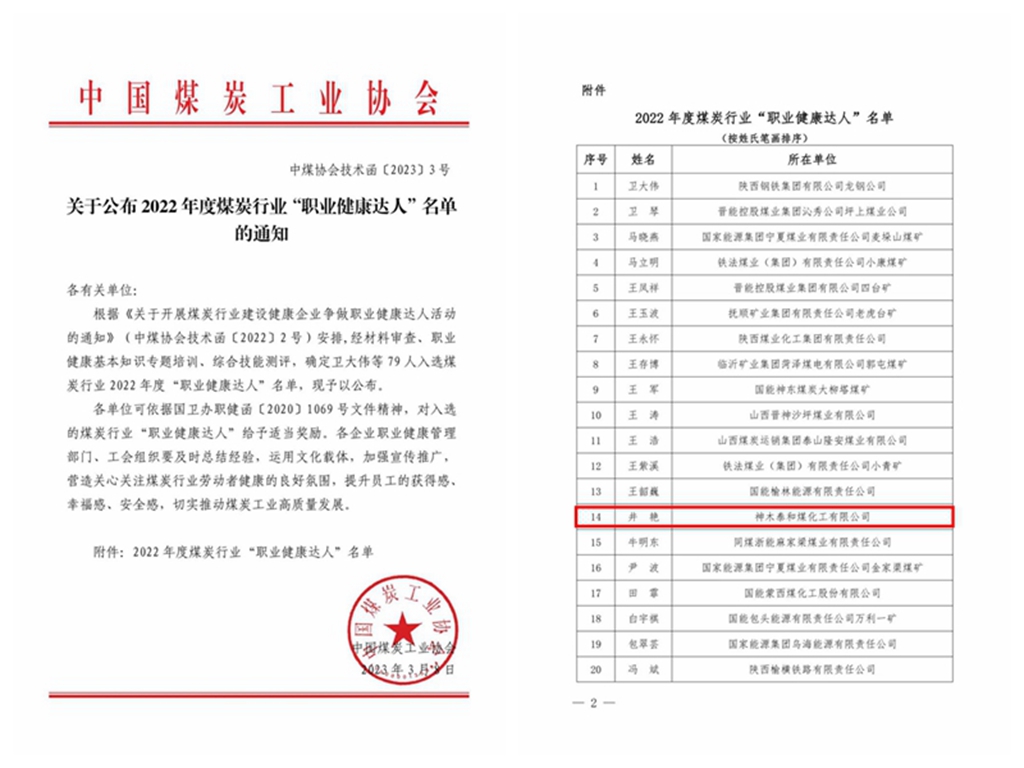近日,神木煤化工泰和公司井艷被中國煤炭工業協會評為2022年度煤炭行業“職業健康達人”。井艷同志是該公司安全環保部職業衛生專職管理人員,主要負責職業衛生管理工作。