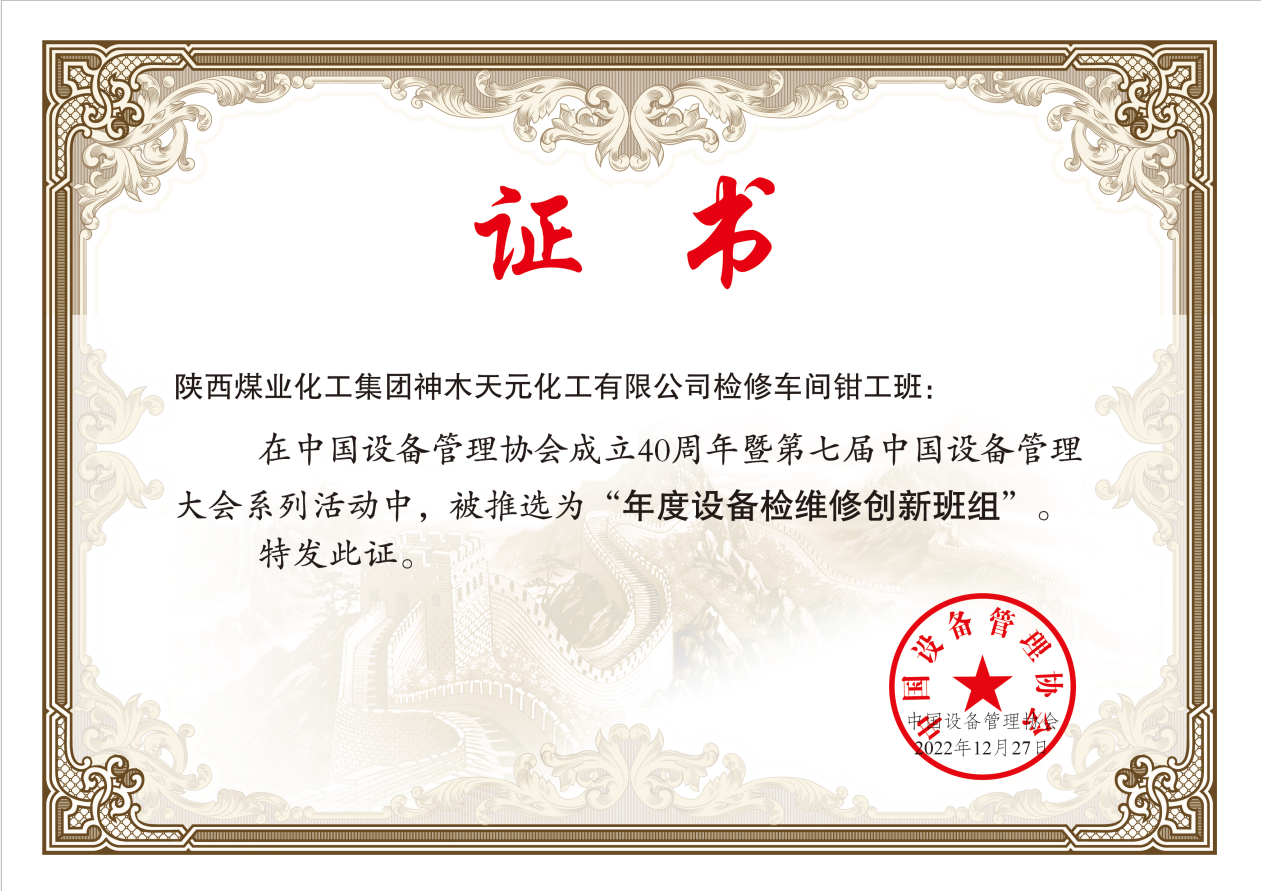 檢修車間鉗工班是神木煤化工天元公司最早組建的機械專業(yè)班組,多次榮獲天元公司先進班組、安全生產(chǎn)先進班組等,并在中國設(shè)備管理協(xié)會成立40周年暨第七屆中國設(shè)備管理大會系列活動中,被推選為“2022年度設(shè)備檢維修創(chuàng)新班組”。