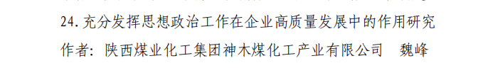 近日,陜煤集團(tuán)下發(fā)了《關(guān)于表彰2023年政研工作與黨建研究優(yōu)秀成果和優(yōu)秀組織單位的通知》,公布了2023年政研工作與黨建研究優(yōu)秀成果及優(yōu)秀組織單位名單,神木煤化工公司榮獲三個(gè)三等獎(jiǎng)和五個(gè)優(yōu)秀獎(jiǎng)。