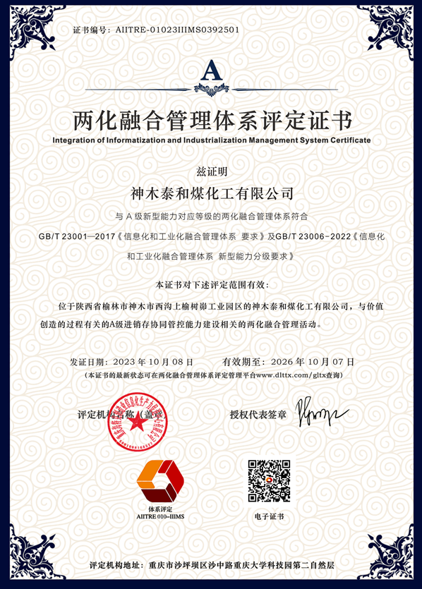 近日,神木煤化工泰和公司順利通過(guò)國(guó)家工業(yè)和信息化部“與價(jià)值創(chuàng)造的過(guò)程有關(guān)的A級(jí)進(jìn)銷(xiāo)存協(xié)同管控能力”的認(rèn)證,榮獲“兩化融合管理體系評(píng)定證書(shū)”。