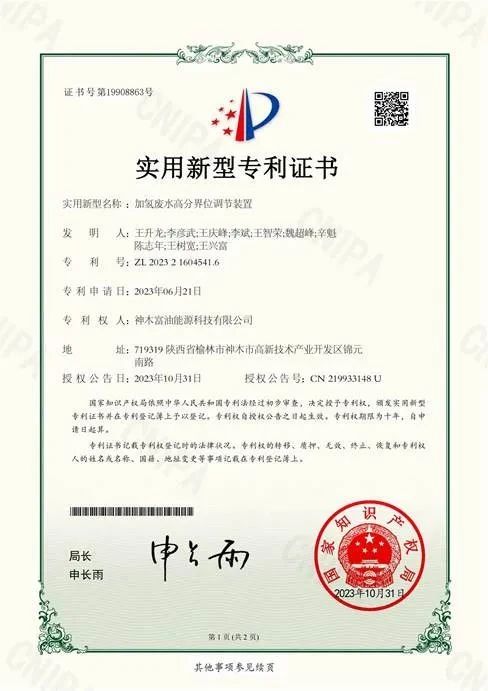 近日,神木煤化工富油公司申請(qǐng)的“加氫廢水高分界位調(diào)節(jié)裝置 ”實(shí)用型專利獲得國(guó)家知識(shí)產(chǎn)權(quán)局授權(quán)。