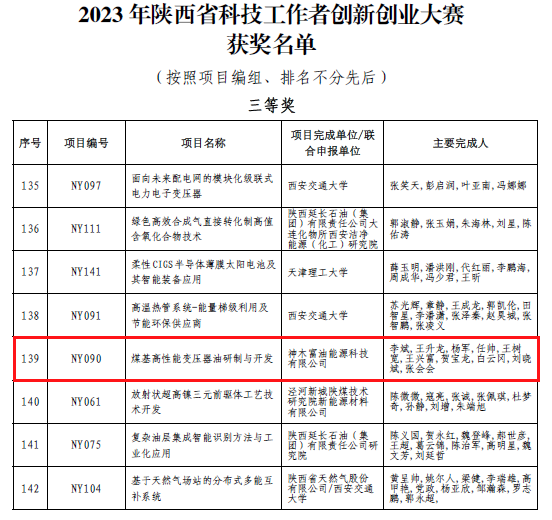 近日,2023年陜西省科技工作者創新創業大賽獲獎名單揭曉,神木煤化工富油公司“煤基高性能變壓器油研制與開發”項目榮獲三等獎。