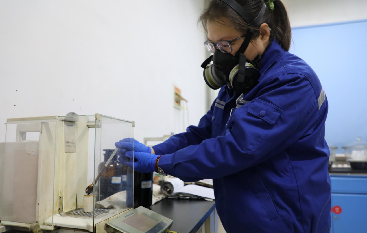 質(zhì)量監(jiān)督部高吉在進(jìn)行煤焦油稱樣