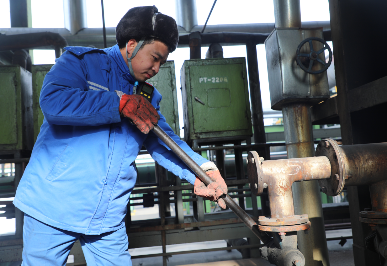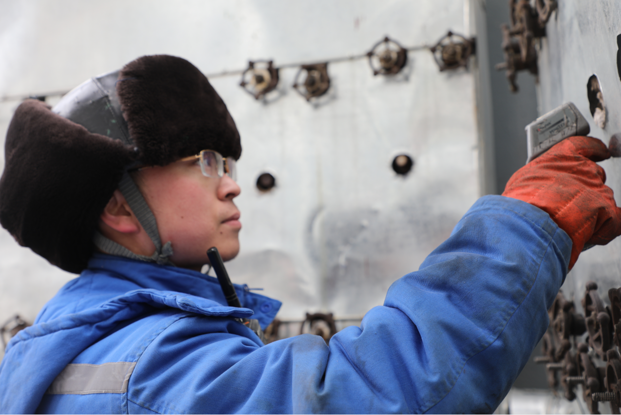 加氫車間杜沛奇在檢查伴熱疏水閥溫度是否正常