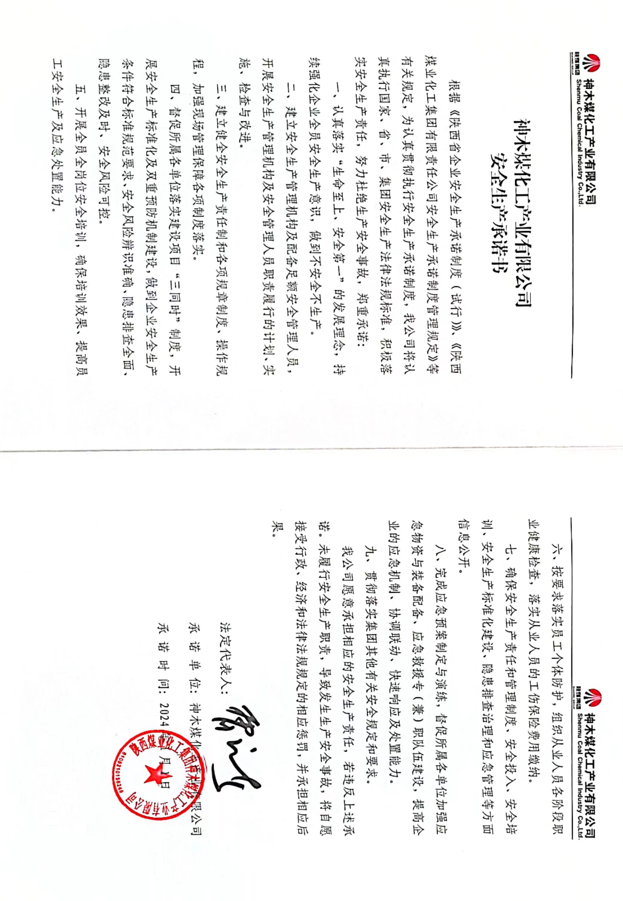 神木煤化工產業(yè)有限公司2024年度安全生產承諾書