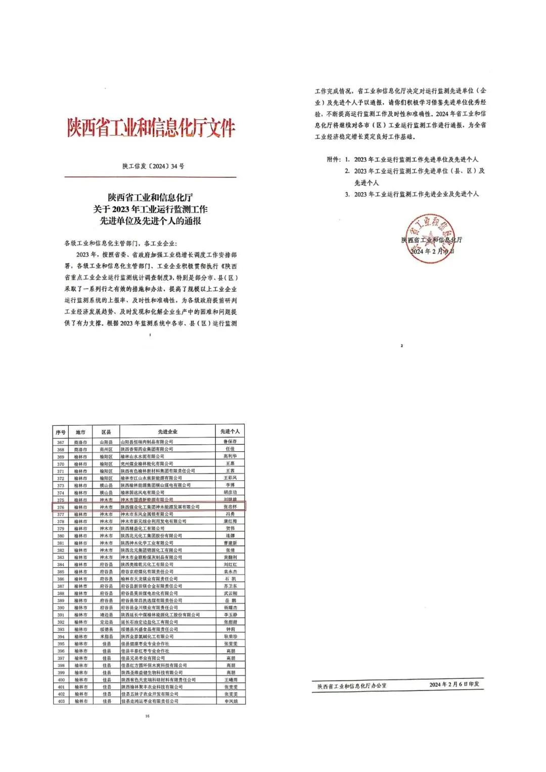 近日,陜西省工業和信息化廳發布《關于2023年工業運行監測工作先進單位及先進個人的通報》,神木煤化工能源公司被評為2023年度全省工業運行監測工作先進單位。