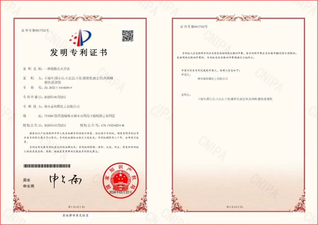 近日,神木煤化工泰和公司申請的發明專利“一種放散點火方法”成功獲得國家知識產權局授權。此項發明專利成功解決了蘭炭行業煤氣應急放散點火難題。
