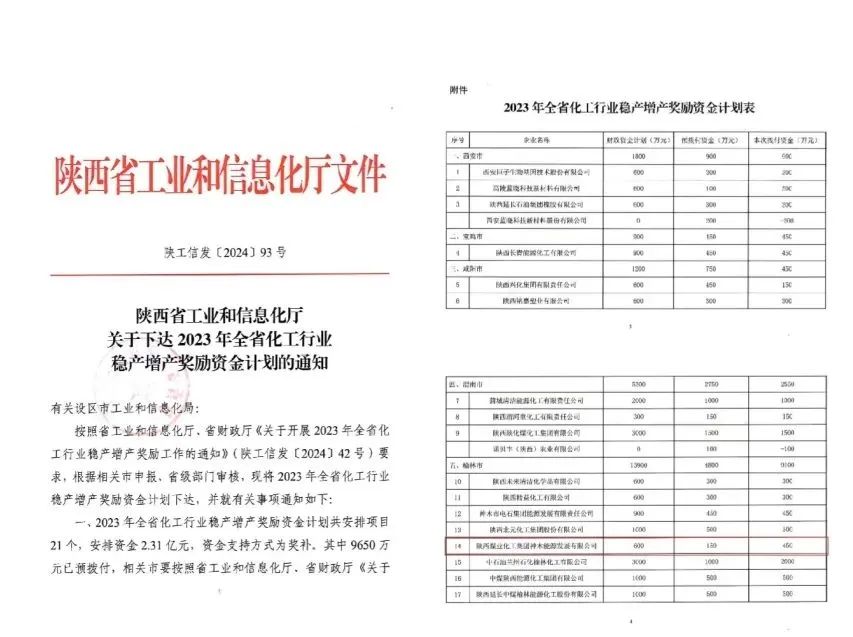 近日,從《陜西省工業(yè)和信息化廳關(guān)于下達(dá)2023年全省化工行業(yè)穩(wěn)產(chǎn)增產(chǎn)獎(jiǎng)勵(lì)資金計(jì)劃的通知》獲悉,神木煤化工能源公司獲陜西省2023年化工行業(yè)穩(wěn)產(chǎn)增產(chǎn)獎(jiǎng)勵(lì)資金450萬(wàn)元。