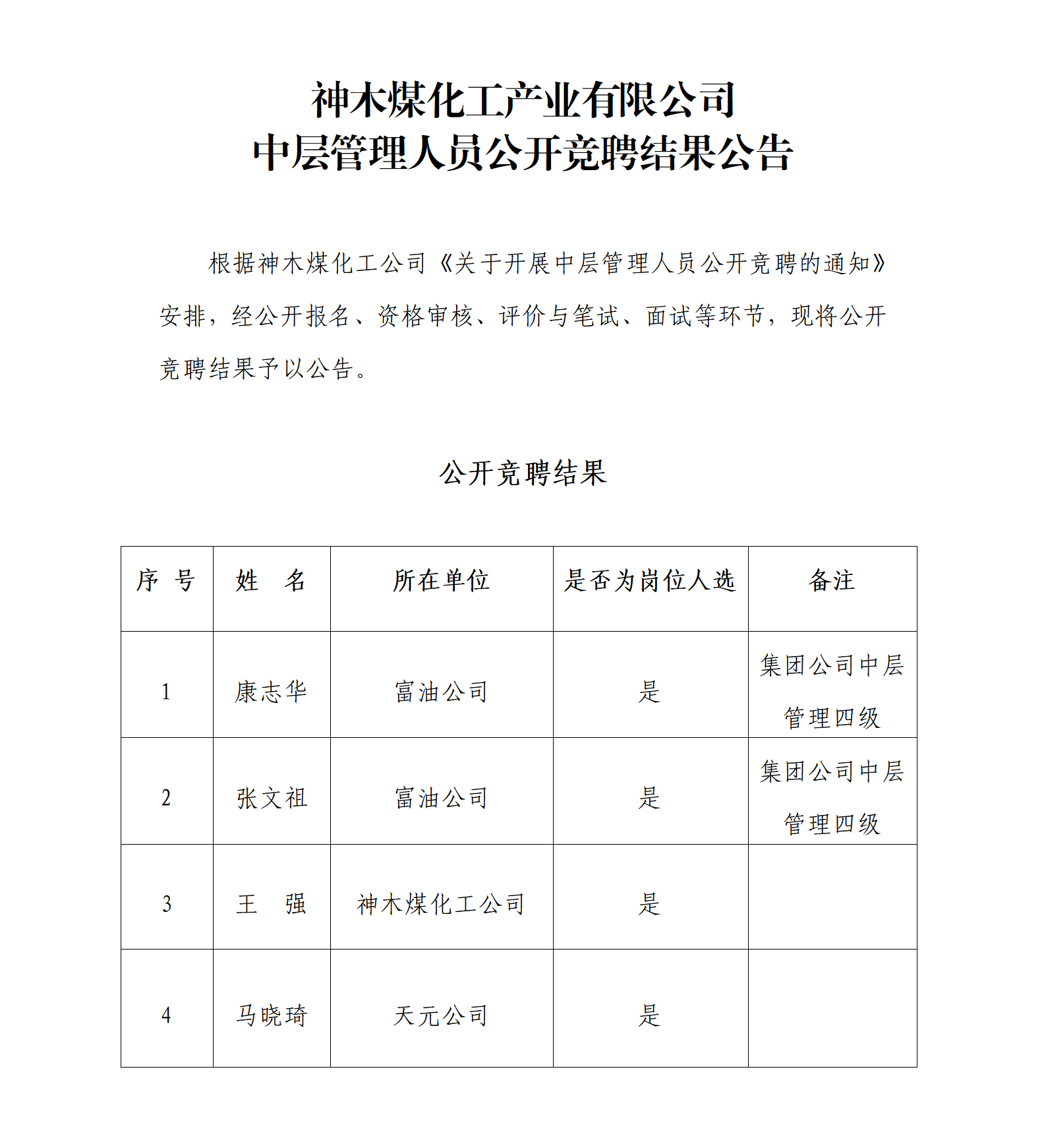 神木煤化工產(chǎn)業(yè)有限公司中層管理人員公開(kāi)競(jìng)聘結(jié)果公告