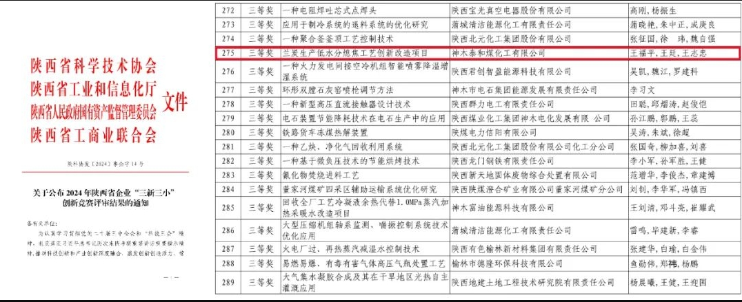 近日,從陜西省企業“三新三小”創新競賽評審結果獲悉,泰和公司“蘭炭生產低水分熄焦工藝創新改造項目”獲2024年陜西省企業“三新三小”創新競賽三等獎。