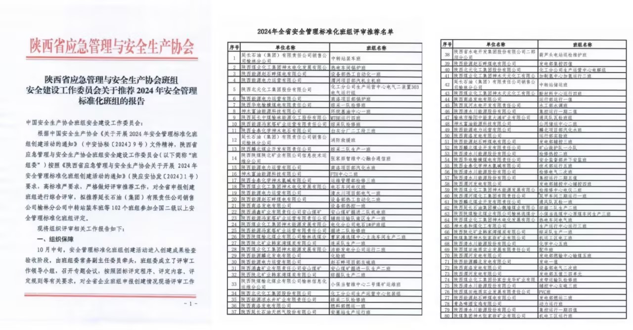 近日,陜西省應急管理與安全生產協(xié)會班組安全建設工作委員會發(fā)布《關于推薦2024年安全管理標準化班組的報告》。神木煤化工富油公司環(huán)烷基油中心一班、公用儲運中心二班及FTH中心二班憑借過硬的安全管理水平,成功獲得全國二級以上安全管理標準化班組評定推薦資格。