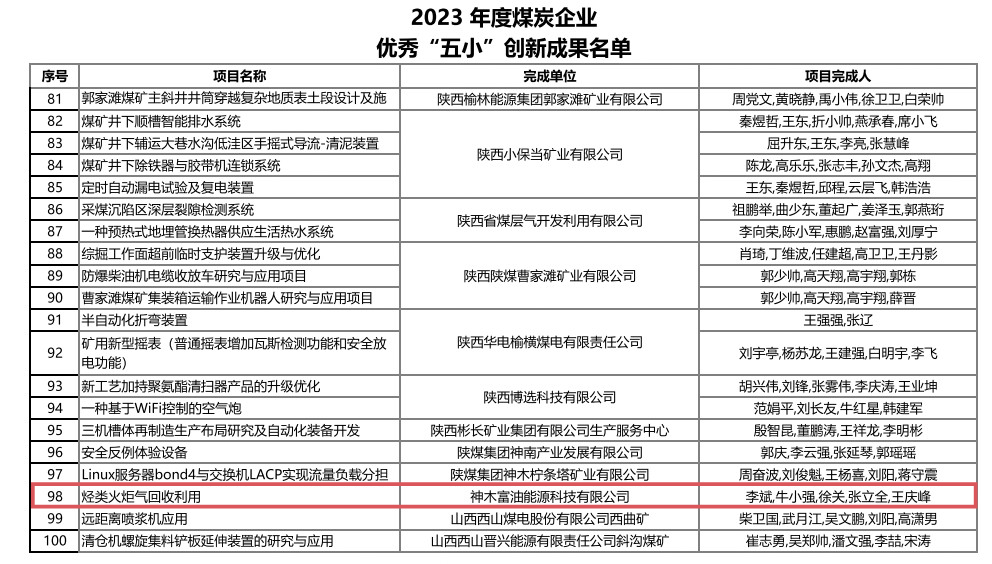 近日,中國煤炭工業(yè)協(xié)會公布了2023年度煤炭企業(yè)優(yōu)秀“五小”創(chuàng)新成果評審結(jié)果,神木煤化工富油公司報送的“烴類火炬氣回收利用”獲評行業(yè)引領(lǐng)型創(chuàng)新成果。