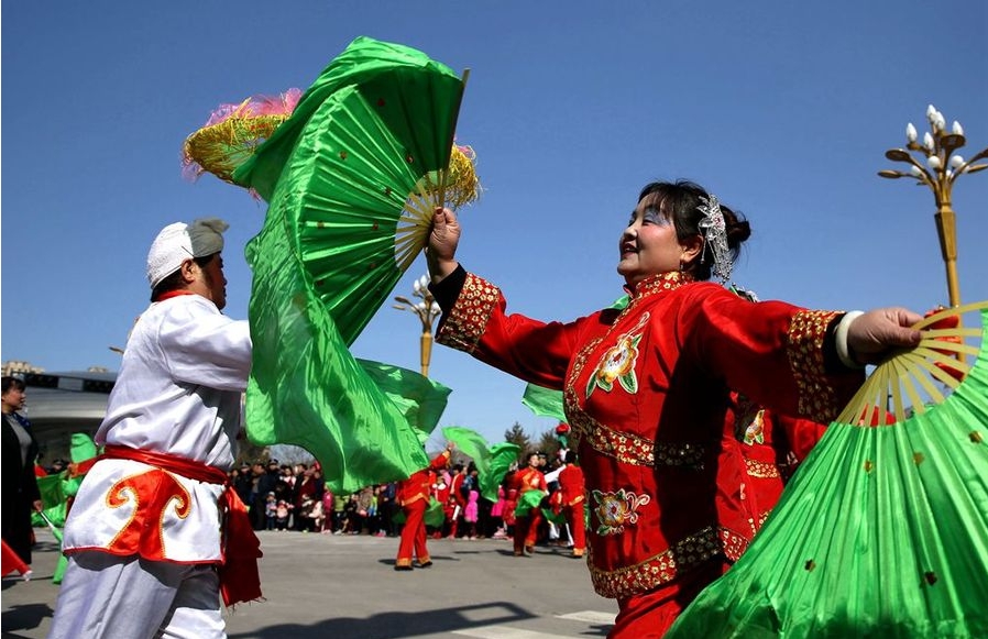 秧歌表演開始了,鼓點聲如驚雷般響起,震撼著大地。鼓手們手持鼓槌,用力地敲擊著鼓面,那節奏時而急促,如萬馬奔騰;時而舒緩,如潺潺流水。镲手們也不甘示弱,手中的镲相互碰撞,發出清脆悅耳的聲響,與鼓聲交織在一起,形成了一曲氣勢磅礴的交響樂。在這激昂的音樂聲中,秧歌隊伍如同一條靈動的巨龍,在廣場上蜿蜒穿梭。
