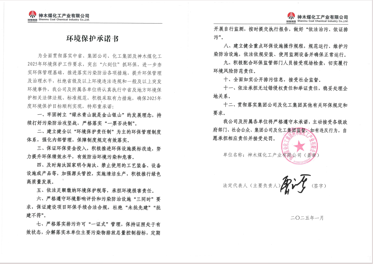 神木煤化工產業有限公司2025年環境保護承諾書