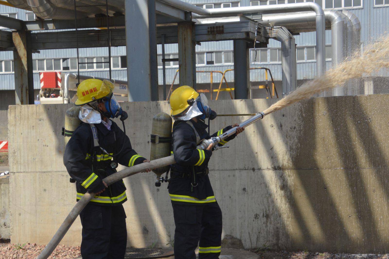 演練模擬FTH車間新成品油罐區V-03罐出口管道法蘭墊片損壞,輕質化煤焦油1#發生泄漏,引起著火。事故發生后,該公司立即啟動了危險化學品事故應急救援綜合預案。經過各應急小組密切配合、高效協作,采取滅火、系統停車、儲罐冷卻、人員救護、油品收集、洗消水回收等措施,事故救援取得圓滿成功。