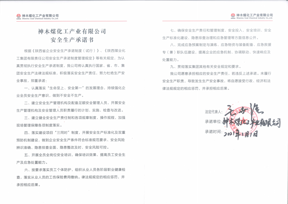 神木煤化工產業有限公司2021年度安全生產承諾書