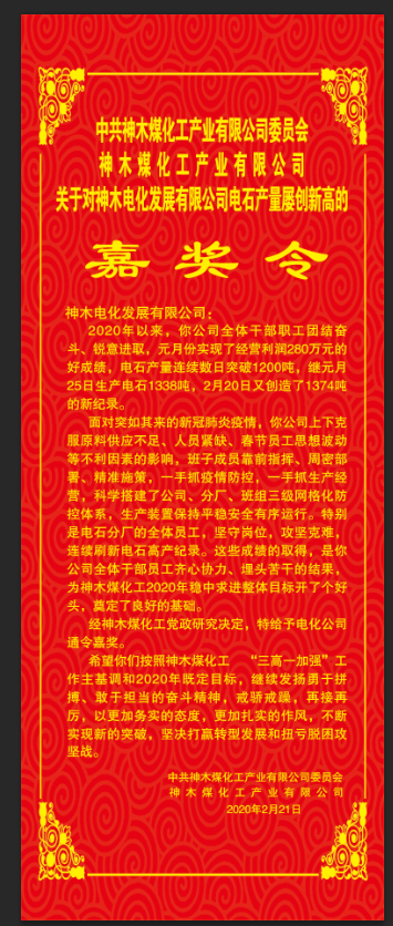 嘉獎(jiǎng)令還特別對(duì)該公司表現(xiàn)突出的電石分廠全體員工給予了充分肯定,該分廠員工節(jié)日期間堅(jiān)守崗位,克服重重困難,連續(xù)作戰(zhàn),不斷刷新電石高產(chǎn)紀(jì)錄,為神木煤化工公司2020年穩(wěn)中求進(jìn)整體目標(biāo)開(kāi)了個(gè)好頭,奠定了良好的基礎(chǔ)。(閔立娟)