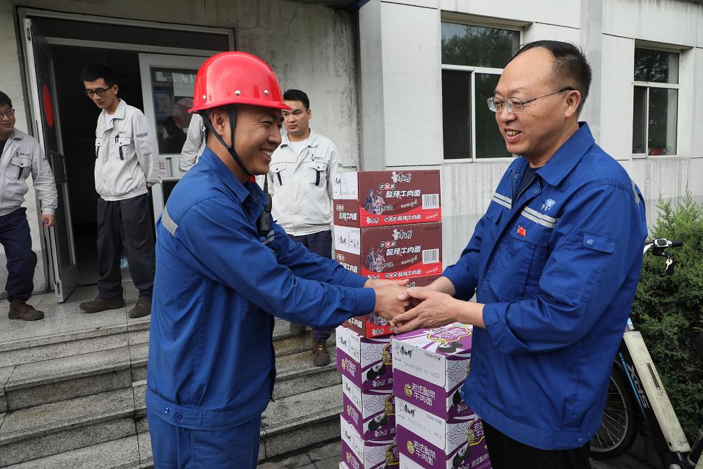 在大修現場,公司黨委副書記、紀委書記、工會主席周樹成,機關第一黨支部書記郭海波、機關第二黨支部書記馬杰及黨員代表為一線員工送上了方便面、礦泉水、藿香正氣水等防暑降溫物品,對參與大檢修的現場管理人員和職工表示親切的慰問和衷心的感謝,并囑咐廣大一線員工,在高溫作業時,一定要注意防暑降溫,注意安全,保重身體;同時希望他們繼續發揚不畏高溫酷暑、依然戰斗在一線的奉獻精神,按計劃加快推進檢修進度,保質保量完成檢修任務。