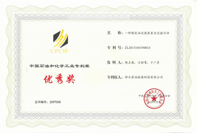 近日,富油公司申報的“一種煤焦油過濾裝置及過濾方法”通過了中國石油和化學工業聯合會科技成果鑒定,獲2020年度石油和化工行業專利優秀獎。