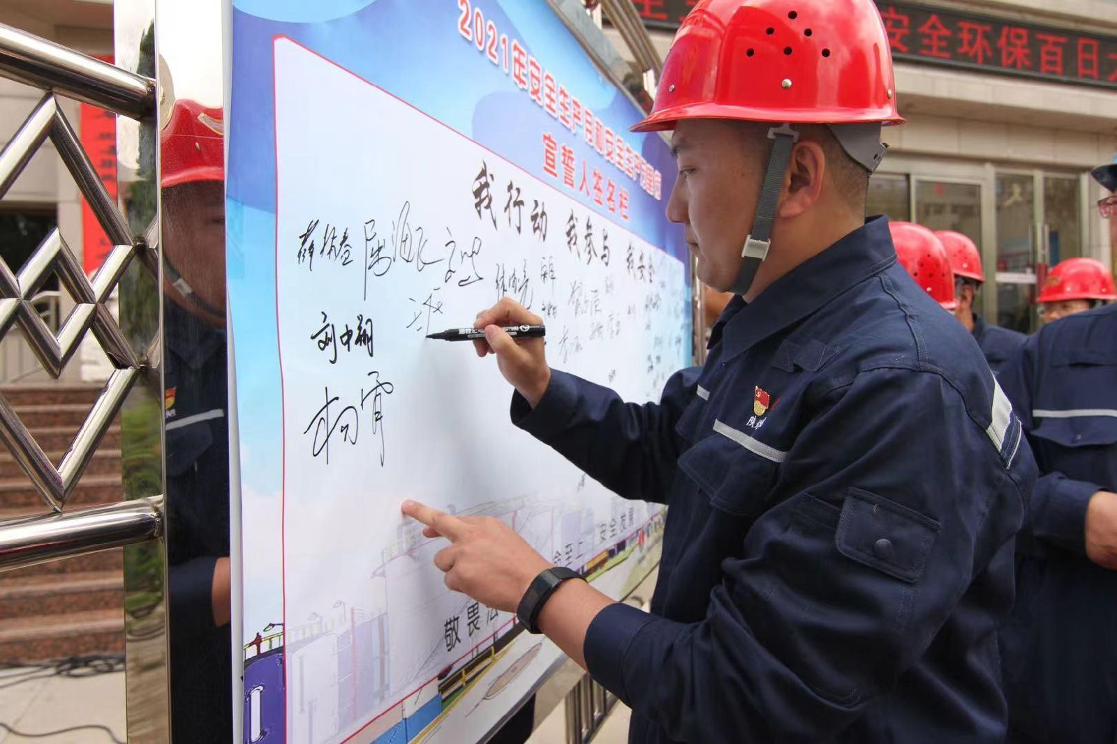 “為了職工的生命安全、家庭的幸福,為了企業(yè)的科學(xué)發(fā)展,社會(huì)的和諧美麗,我宣誓......”電化公司副總經(jīng)理張德亮帶領(lǐng)全體參會(huì)人員,舉起右拳,莊嚴(yán)宣誓,并鄭重地在誓詞簽名墻上簽名。