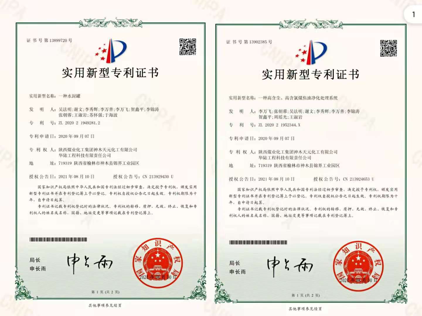 上述獲得授權的2件專利分別為“一種高含塵、高含氯煤焦油凈化處理系統”“一種水封罐”。“一種高含塵、高含氯煤焦油凈化處理系統”解決的技術問題在于克服現有技術中在對煤焦油進行凈化時,不能充分降低粉塵和氯含量,不能滿足煤焦油后續加工的要求等問題;“一種水封罐”解決的技術問題在于克服現有的水封罐罐體底部的灰塵不易清理,且無法在水封罐工作時同步清理的缺陷。