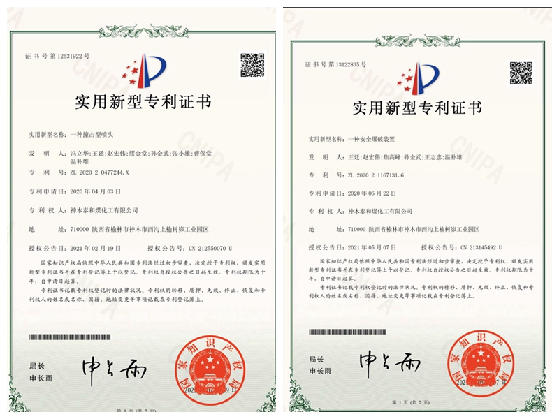 近日,泰和公司接連收到兩份國家知識產權局下發的實用新型專利證書,分別是“一種安全爆破裝置”、“一種撞擊型噴頭”兩項實用新型專利。