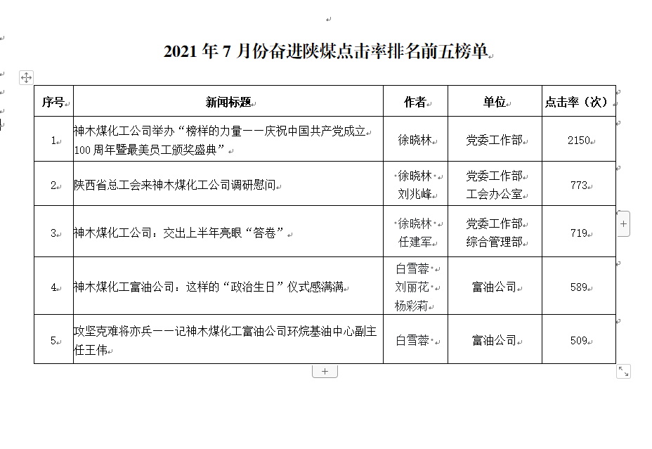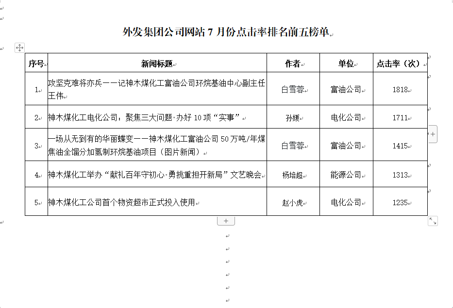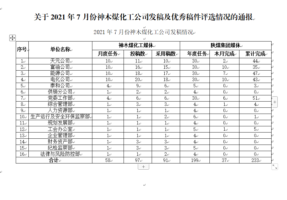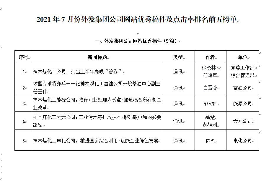 關于2021年7月份神木煤化工公司發稿及優秀稿件評選情況的通報