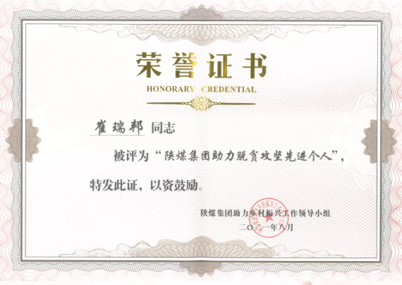近日,天元公司崔瑞邦同志被評為“陜煤集團助力脫貧攻堅先進個人”。