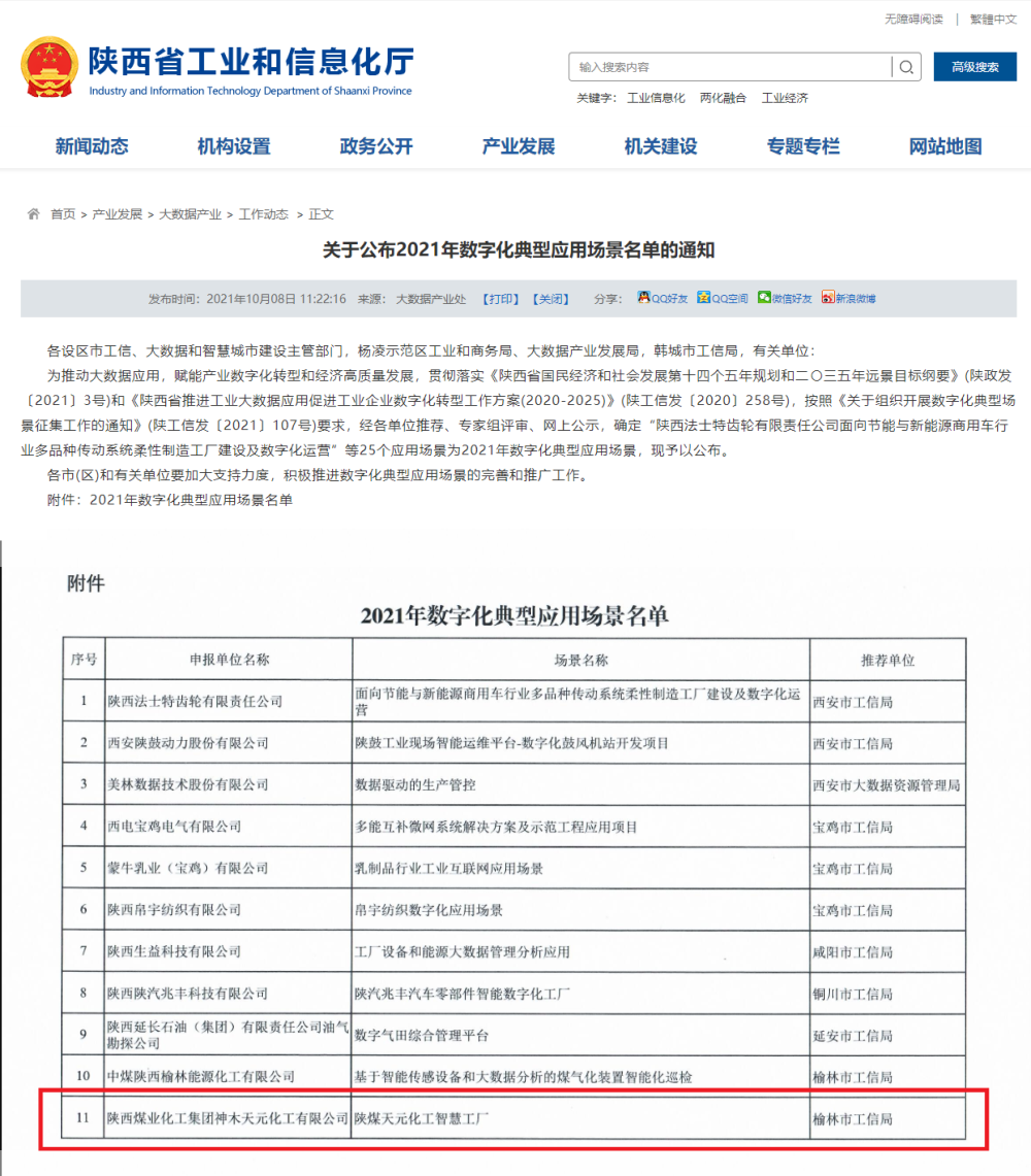 陜煤集團微信:“陜煤天元化工智慧工廠”入選陜西省2021年數字化典型應用場景名單