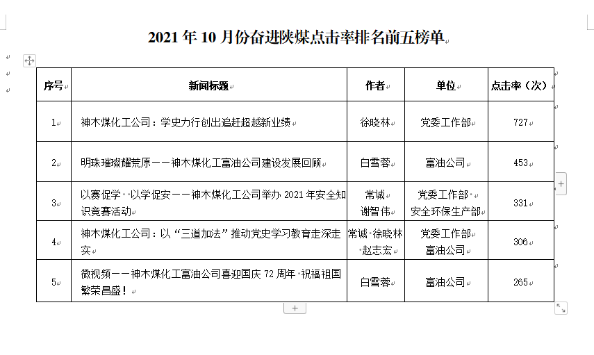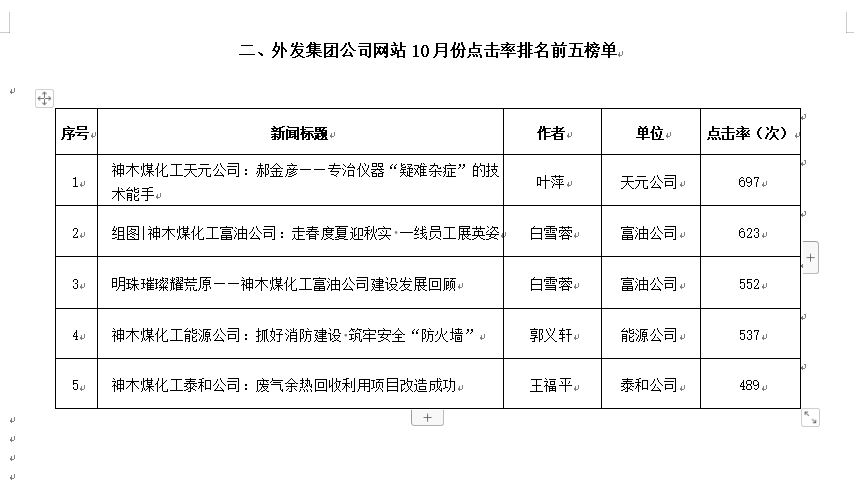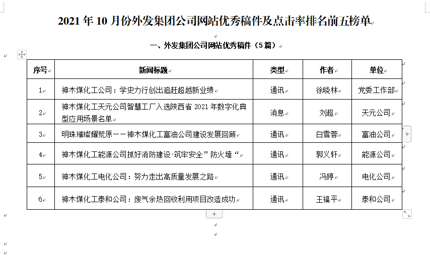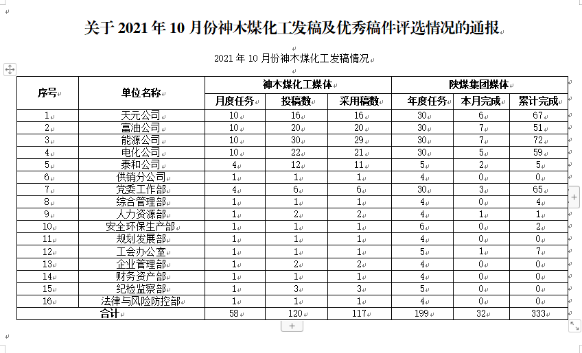 關于2021年10月份神木煤化工公司發稿及優秀稿件評選情況的通報