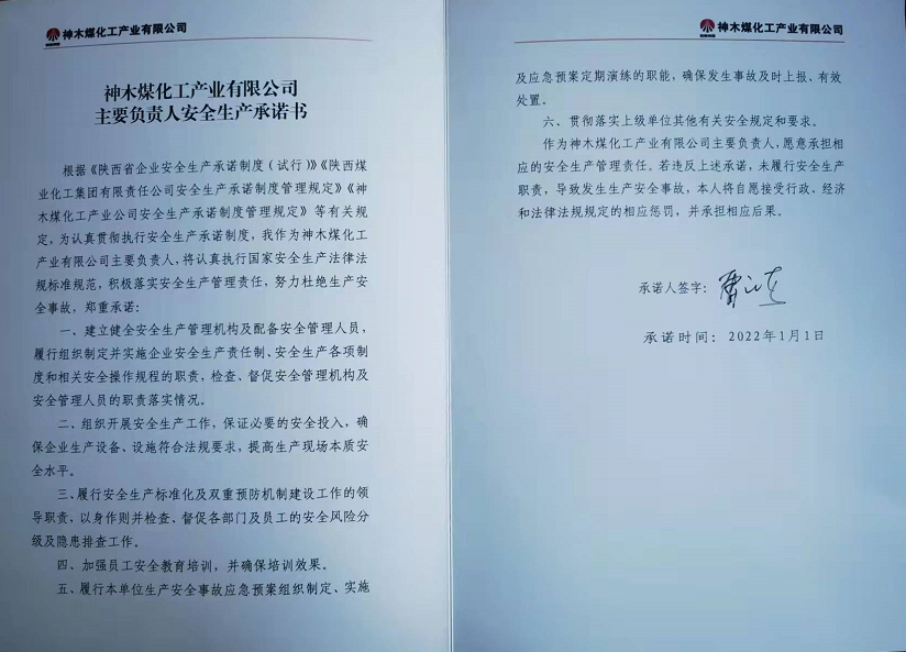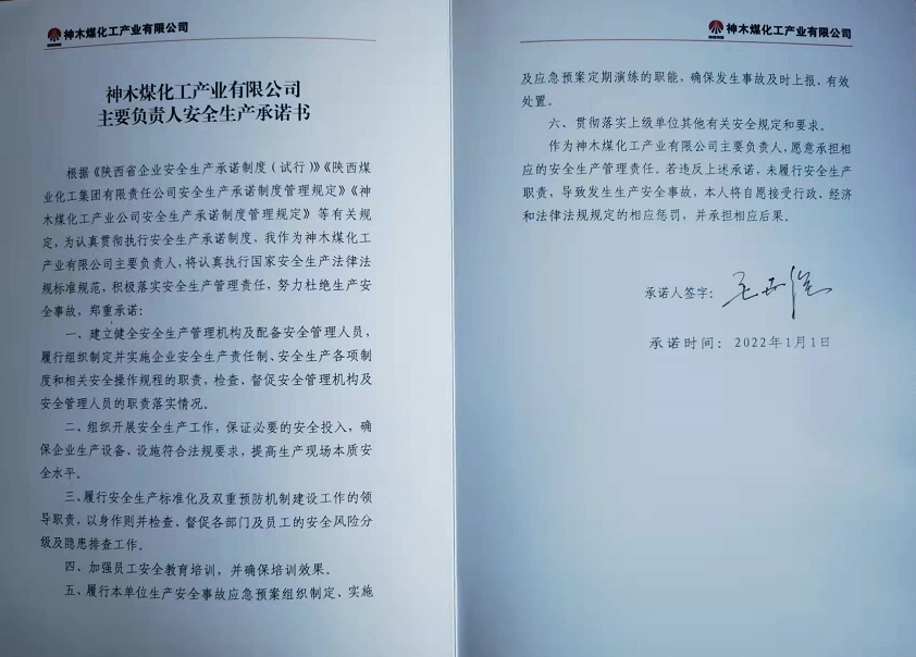 神木煤化工產(chǎn)業(yè)有限公司主要負責人2022年安全生產(chǎn)承諾書公示