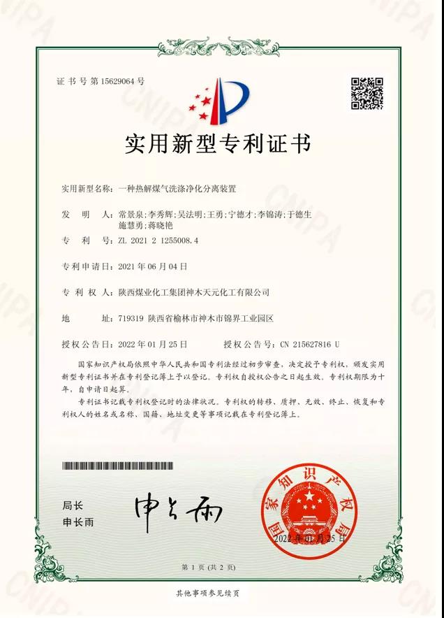 近日,神木煤化工天元公司申請的“一種熱解煤氣洗滌凈化分離裝置”實用新型專利獲得國家知識產權局授權。