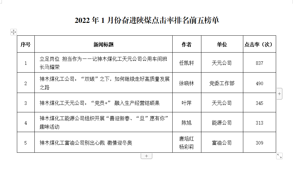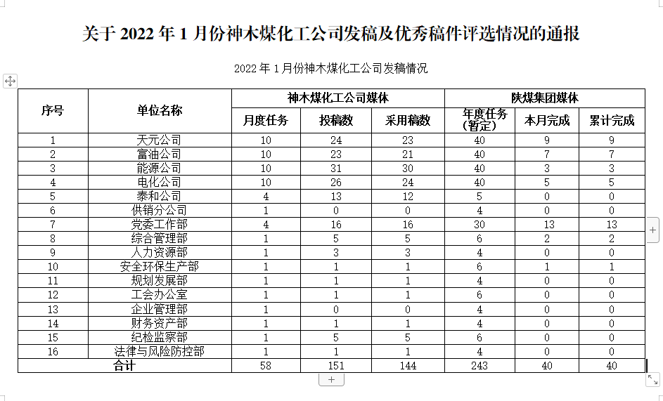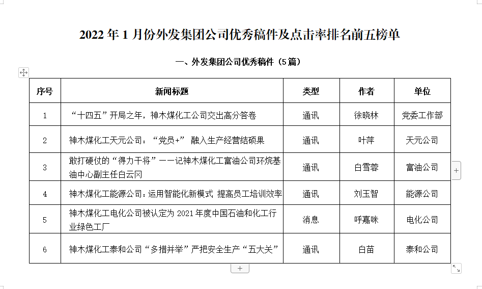 關于2022年1月份神木煤化工公司發稿及優秀稿件評選情況的通報