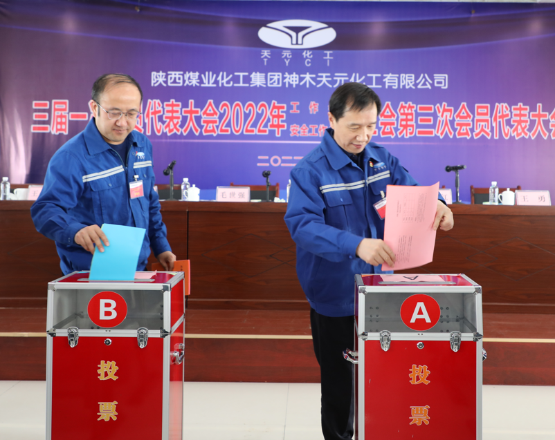 會議還聽取審議了天元公司黨委副書記、紀(jì)委書記、工會主席樊戰(zhàn)明作的題為《融入中心創(chuàng)實效精準(zhǔn)服務(wù)聚合力 為公司轉(zhuǎn)型升級高質(zhì)量發(fā)展提供堅強保障》的二屆工會委員會工作報告,聽取了天元公司安全總監(jiān)王小龍作的題為《深學(xué)苦練強本領(lǐng) 防微杜漸保安全 攻堅克難促環(huán)保 降污減排守藍天 為公司轉(zhuǎn)型升級高質(zhì)量發(fā)展保駕護航》的安全工作報告、《二屆工會經(jīng)費審查委員會工作報告》和《二屆六次會員代表大會提案落實和三屆一次會員代表大會提案征集情況的報告》,選舉產(chǎn)生了新一屆工會委員會委員、工會經(jīng)費審查委員會委員、女職工委員會委員和監(jiān)事會職工代表,表彰了2021年度先進集體和先進個人。