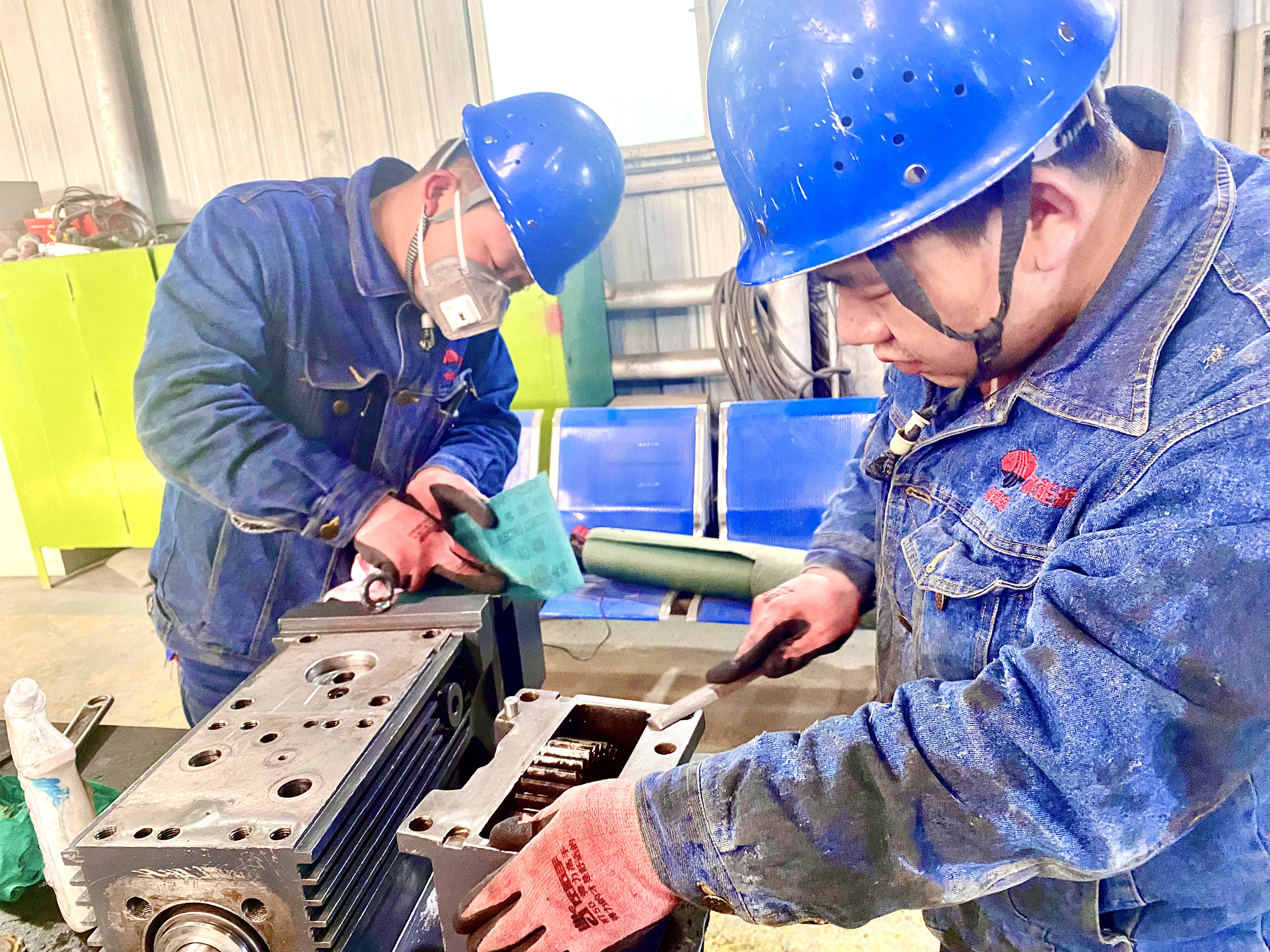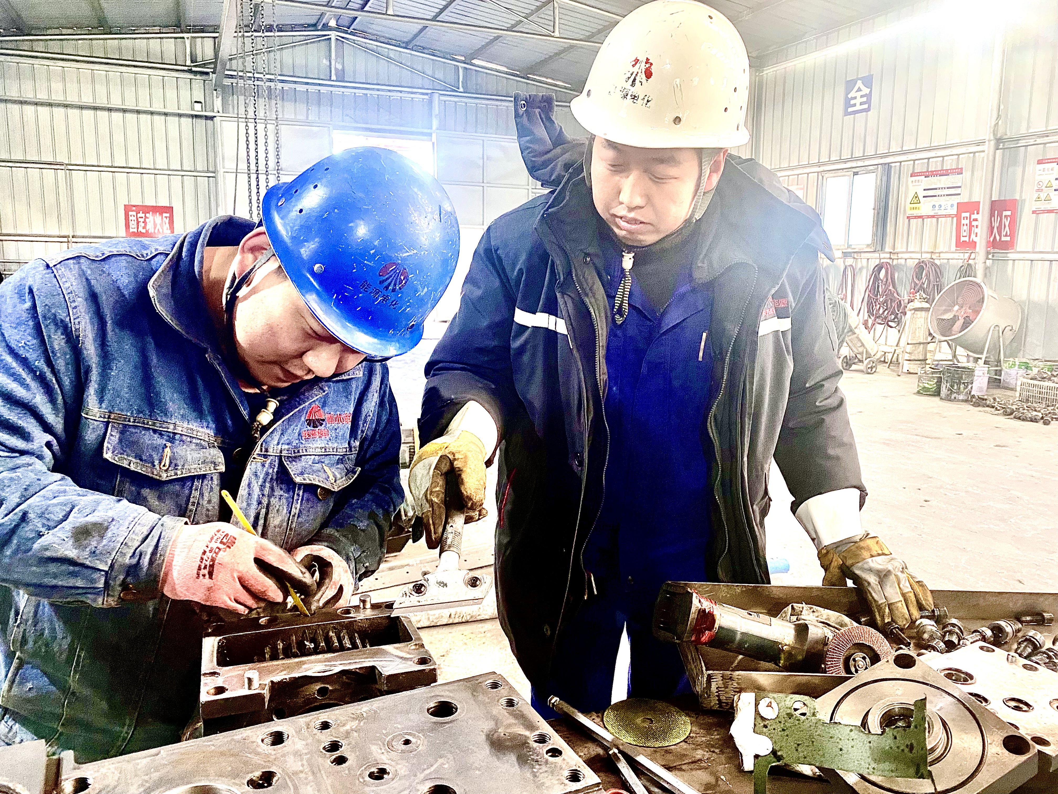 “與其反復(fù)周轉(zhuǎn)維修,不如咱們自己研究攻破難關(guān),徹底解決這一困境。”在分公司領(lǐng)導(dǎo)的組織下,黨員及電石機修“巧匠”成立以劉建為隊長、加航為副隊長的鑿巖機維修攻關(guān)隊,并召開專題會議,精心謀劃、周密部署。“加航負責(zé)與廠家溝通,了解配件原始參數(shù)進行尺寸對比測量”、“李亞飛負責(zé)制作檢修平臺,清理鑿巖機油污”、“張文兵負責(zé)鑿巖機設(shè)備解體,拆卸連接螺栓、拆卸旋轉(zhuǎn)油泵、油封、主軸、鏈接管”、“王志強負責(zé)與就近外協(xié)單位聯(lián)系加工配件”.....明確任務(wù)、合理分工,經(jīng)過大家專心研究攻關(guān),僅用2天時間查到鑿巖機故障的主要原因是漏油、絲桿滑絲、不抓釬等問題。該攻關(guān)隊立即從安全、質(zhì)量、進度、成本以及6S管理方面制定了詳實的“維修方案”。面對時間緊、任務(wù)重、難度大、檢修人員短缺、天氣寒冷等重重困難,全體隊員勠力同心、迎難而上、加班加點,最終以不到15天的時間攻克難題。
