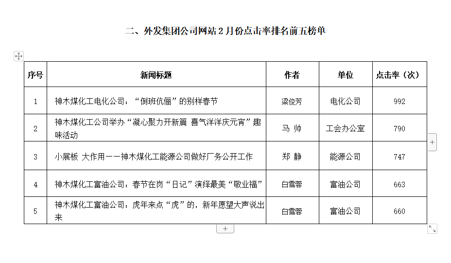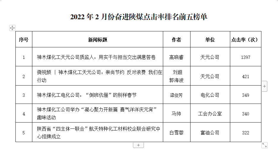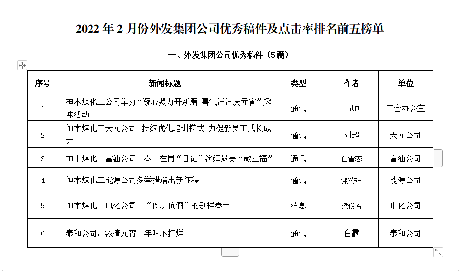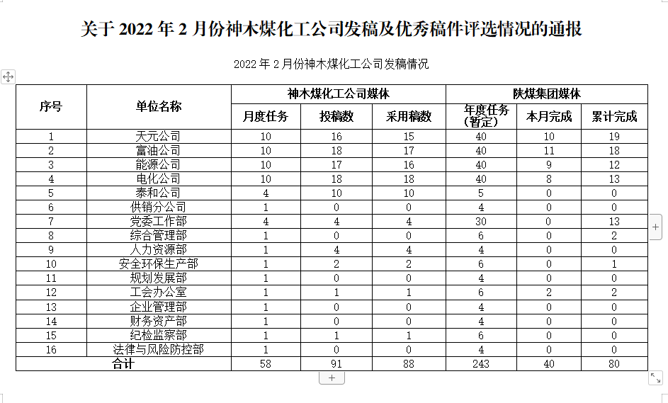 關(guān)于2022年2月份神木煤化工公司發(fā)稿及優(yōu)秀稿件評選情況的通報