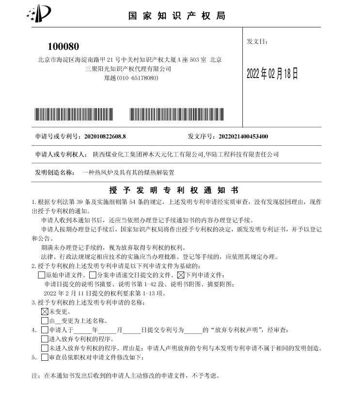 近日,神木煤化工天元公司申請(qǐng)的“一種熱風(fēng)爐及具有其的煤熱解裝置”發(fā)明專(zhuān)利獲得國(guó)家知識(shí)產(chǎn)權(quán)局授權(quán)。