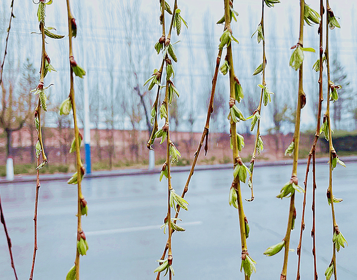晨觀細雨落春枝,柳輕舒,燕嬌呼,報春遲,粉桃含苞怒。見伊笑,眼漸蘇,簇簇含羞綻,一如她心意,寸寸隨春染。(白雪蓉)